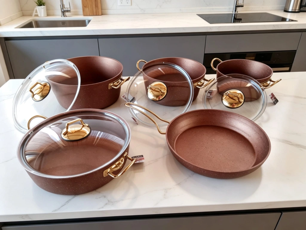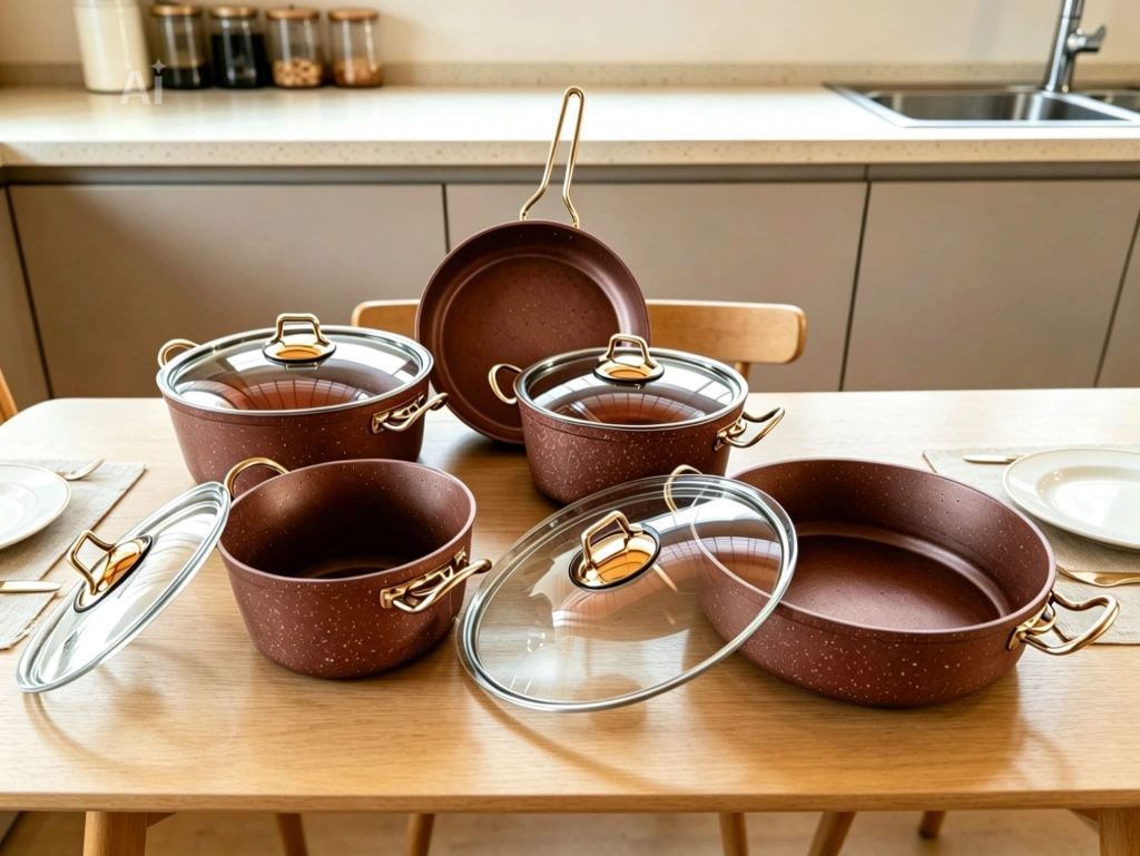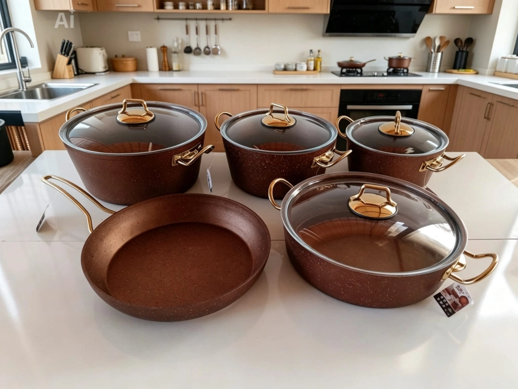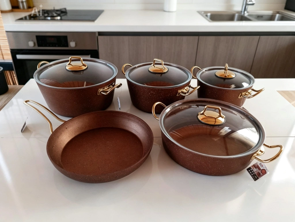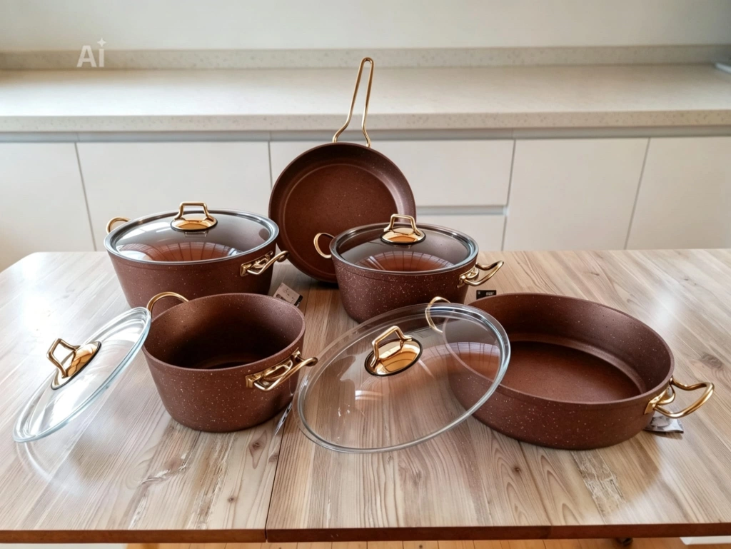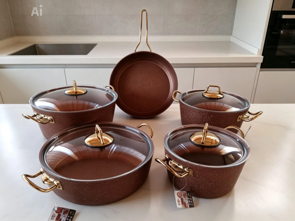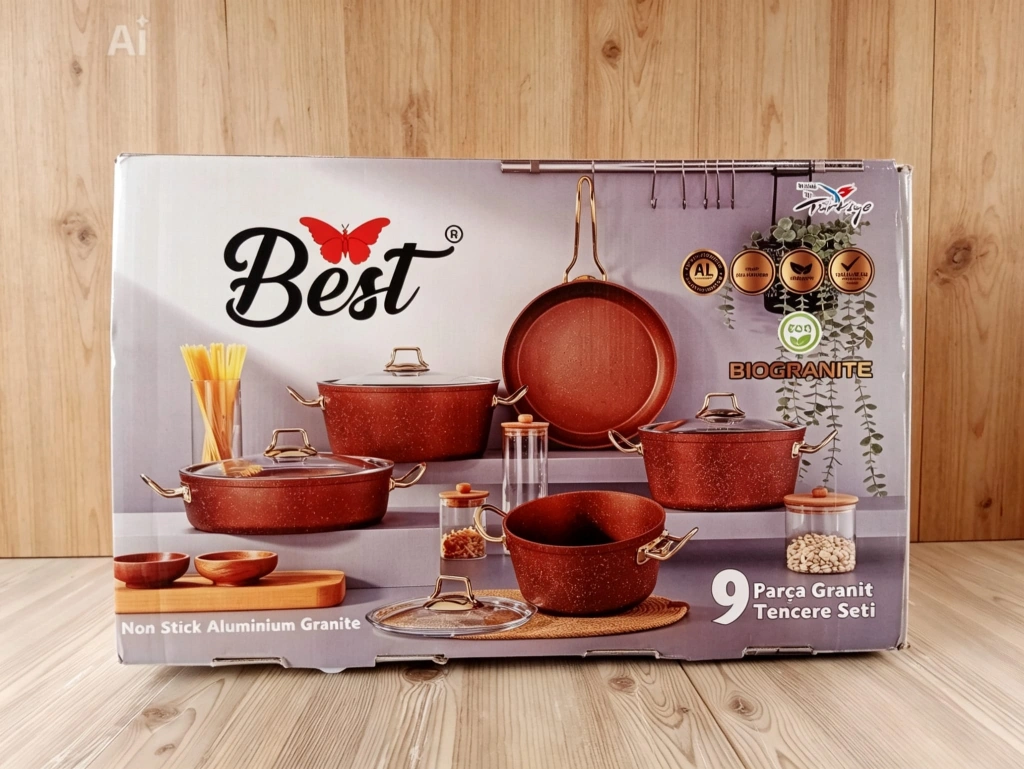 1. Sınıf A kalite. 9 Parça granit tencere seti. Yüksek kaliteli granit kaplamalı, şık tasarımlı tencere ve tava seti. Farklı boyutlardaki parçalarıyla mutfakta pratik kullanım sunar. Altın rengi detayları ve cam kapaklarıyla estetik bir görünüm sağlar.